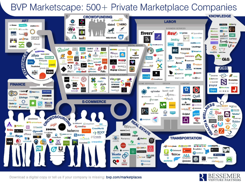 이는 40% 이상 성장하고 있는 인터넷 사용 시간에 비한다면 오히려 6% 가량 줄어들고 있으며, 2013년에서 2015년 사이에 우버, 에어비엔비 그리고 스터브허브의 총체적인 사용량은 145%나 증가 한 것을 같이 언급하며, 이러한 현상이 확실함을 강조 한다. 그리고 이전 블로그에서 “어떻게 우버와 에어비엔비가 수평적 마켓플레이스를 Disrupt 하는가 (vertical marketplaces like Airbnb and Uber are disrupting horizontal ones)” 언급된 disruption의 현상을 다시 집어내며, 제시하였던 “새로운 엔드투엔드의 거래형 마켓플레이스 모델 (new end-to-end and transactional marketplace models)” 모델을 상기하며 아래의 새로운 마케플레이스 Landscape을 제시 하였다.