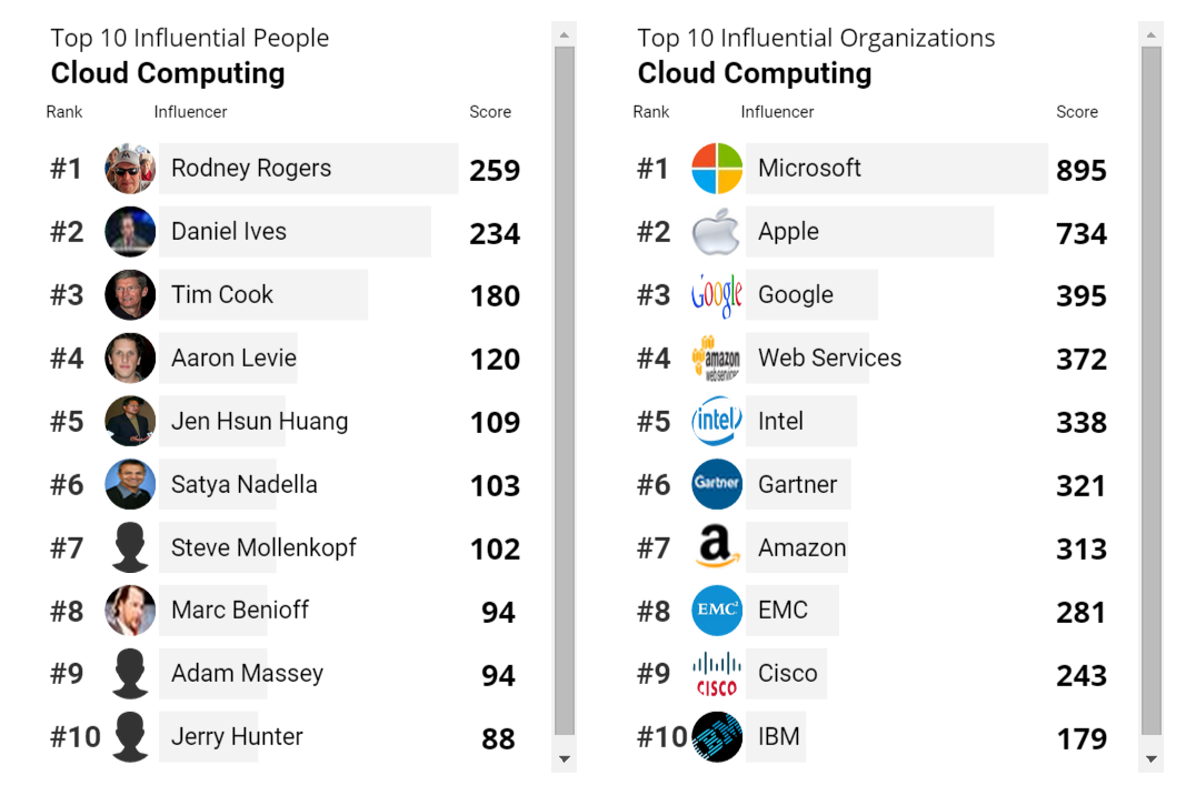 과거 90일 동안 클라우드컴퓨팅에 어떤 변화와 그변화의 영향력은 어디서 그리고 누구에게서 나오는지 한눈에 파악 할 수 있도록 한 웹페이지로서 Appinions의 인플루언스 마케팅 플랫폼을 통해 일일 업데이트된다고 한다.