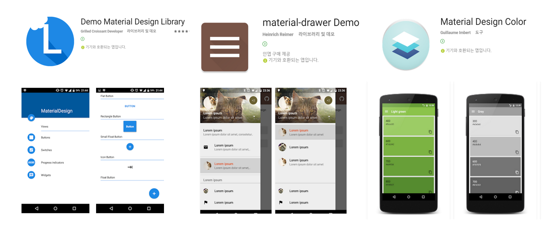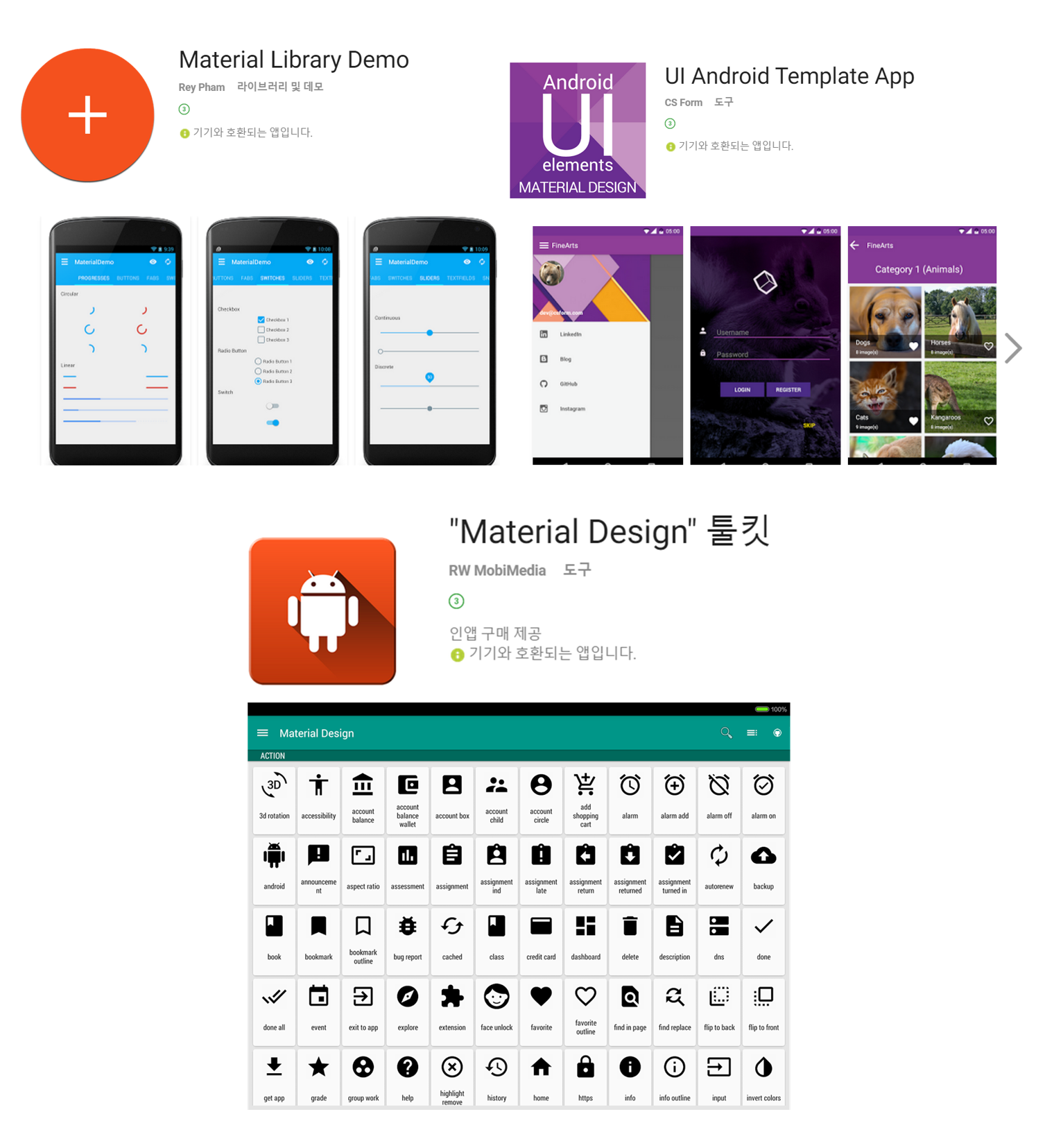 그외에 메신저와 기상위젯은 흔히 Google Play에서 볼 수 있는 앱이고, 검색창에서 “Material Design”을 입력하여 여러앱을 브라우징 할 수 있다. 그리고, GitHub에서 프로젝트를 하거나 Demo로 올려 놓은 앱을 다운받아 머티리얼 디자인 입문자는 도움을 받을 수 있다.