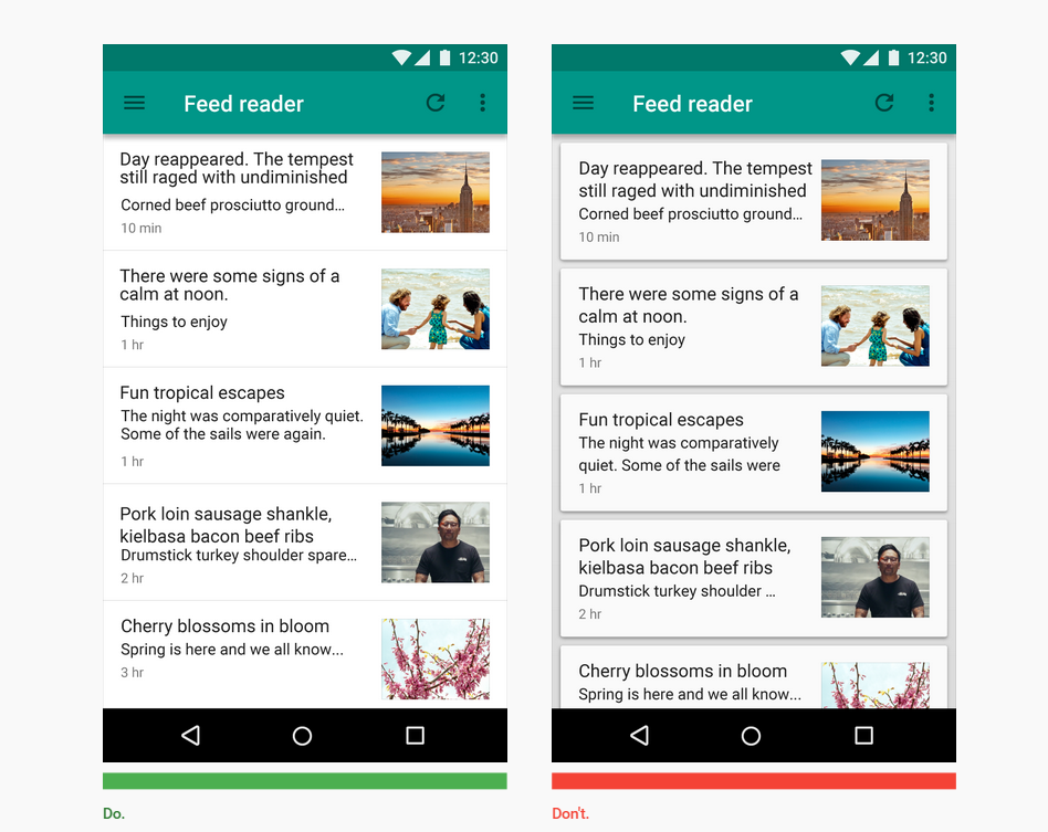 구글의 디자인 철학과 이에 따른 가이드, 리소스 그리고 머티리얼 Icon과 폰트 등, 웹/모바일 디자이너와 기획자라면 북마크하고 자주 방문하여 참조 해야할 사이트가 아닐까 싶다. 개인적으로 제일 관심이 쏠린 첫번째 섹션은 “카드“, 구글이 말하는 카드 UI의 일관된 요소가 먼지 확실하게 세겨진 듯하다.
