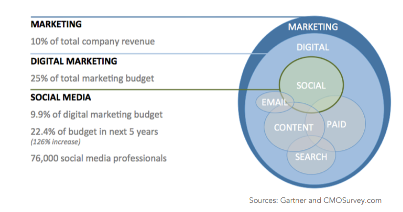 2015년 소셜 미디어 예산은 총 디지털 마케팅 예산의 9.9%를 차지 했고 향후 5년 후에는 22.5%까지 성장 할 것으로 예상됩니다.